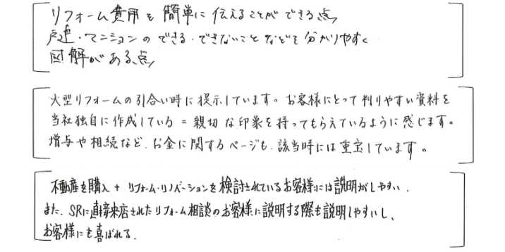 このツールを商談の最初にお客様へお渡しすることで、よりスムーズに本音を聞き出せるようになり、リフォーム提案の質が向上します。