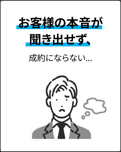 お客様の本音が分からなければ、最適な提案ができず、成約率も上がりません。そこで、当社はお客様の本音を引き出し、信頼を築くための営業ツールを開発しました。