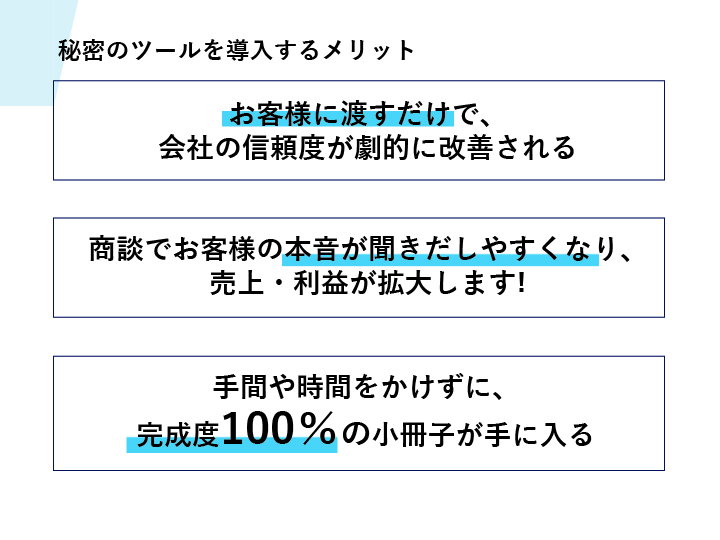 リフォームまるわかり大辞典は小さなリフォーム会社でも一瞬にして、ハウスメーカー並みに信頼度が高まり、成約率が高まる営業ツールです。